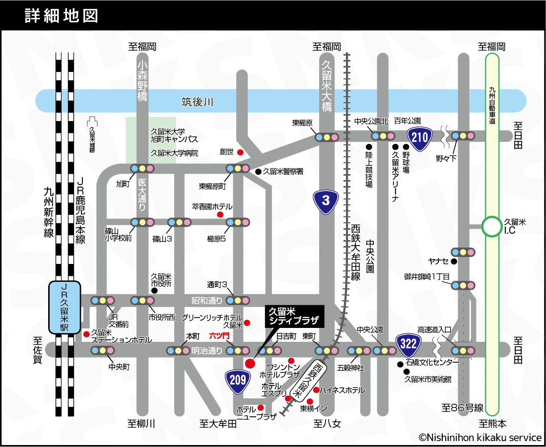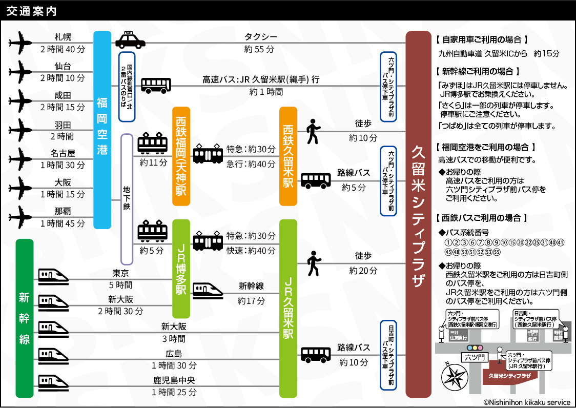 久留米シティプラザ 〒830-0031 福岡県久留米市六ツ門町8-1 TEL:0942-36-3000 FAX:0942-36-3087 HP:http://kurumecityplaza.jp/ 高速バス時刻表(西鉄バス) 西鉄くらしネット 九州旅客鉄道株式会社